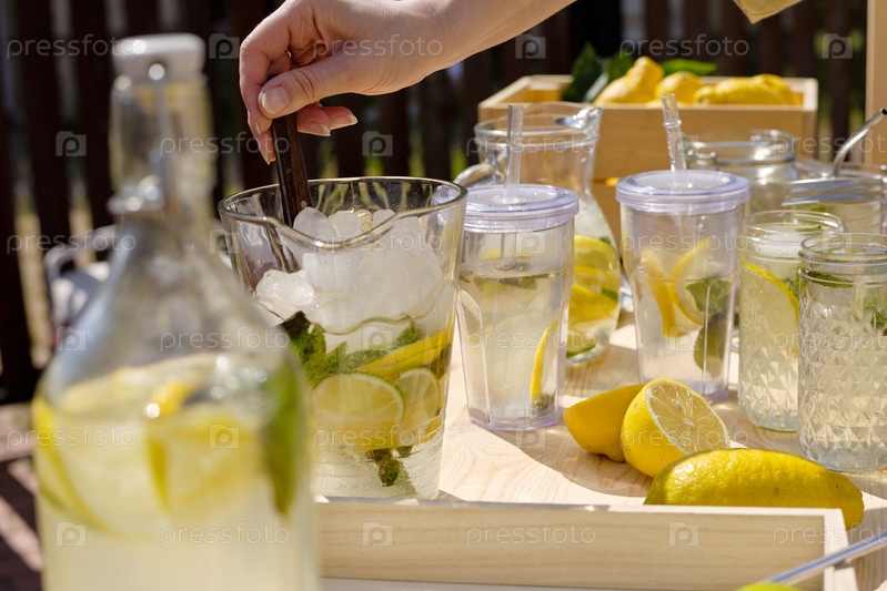 Рука молодой самки сжимает кусочки лимона и смешивает их с кубиками льда