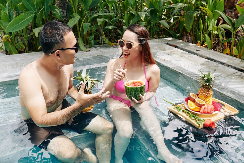 Пара завтракает в бассейне