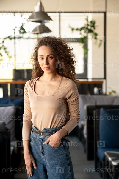 Молодая самоуверенная бизнесвумен в повседневной одежде, держащая руку в кармане джинсов