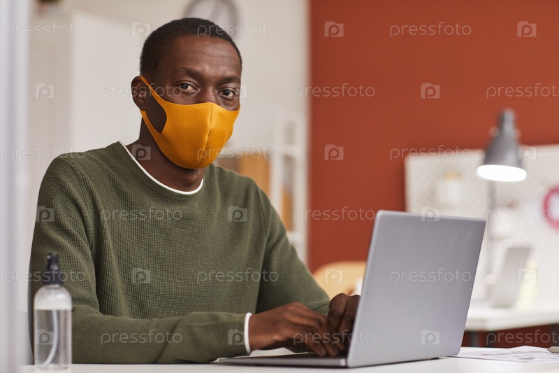 Африканский бизнесмен, носящий маску за рабочим столом