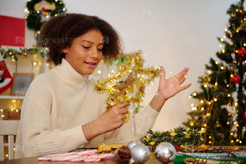 Девушка украшает звезду на рождественской елке