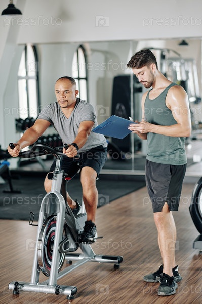 Концентрированный мужчина едет на стационарном велосипеде