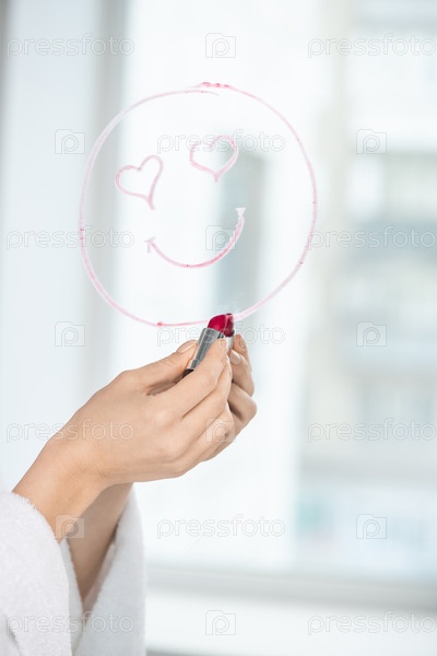Рука девушки с пурпурной помадой, рисующая лицо с улыбкой и глазами в форме сердца