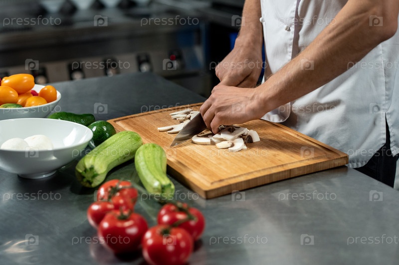 Руки молодого мужского повара современного ресторана, режущего грибы на деревянной доске