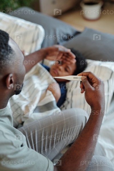 Рука молодого осторожного отца, смотрящего на термометр после измерения температуры