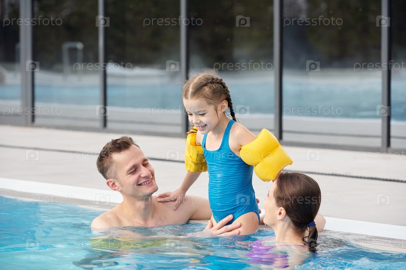 Веселые родители играют со своей очаровательной дочерью в бассейне