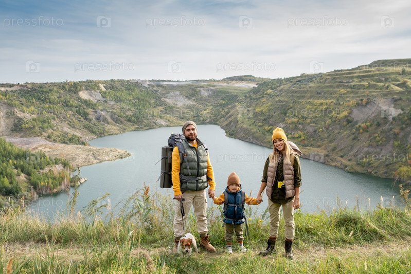 Счастливая семья молодой пары и их маленького сына в теплом casualwear having trip