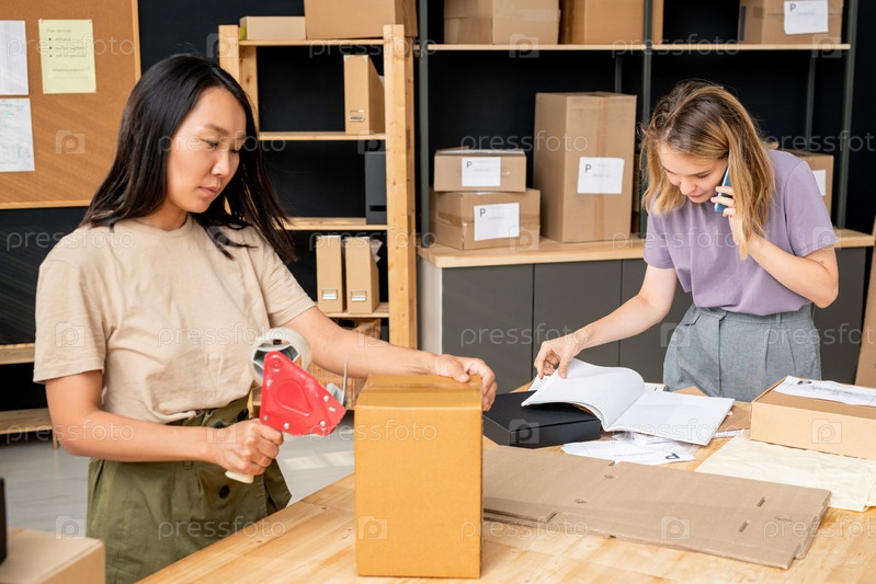 Молодая азиатская женщина запечатывает упакованный заказ в картонной коробке против коллеги
