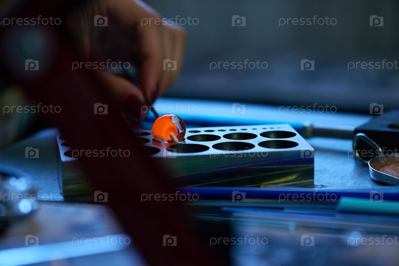 Рука молодой квалифицированной женщины-ремесленницы, которая ставит обгоревшую стеклянную заготовку в перерыв