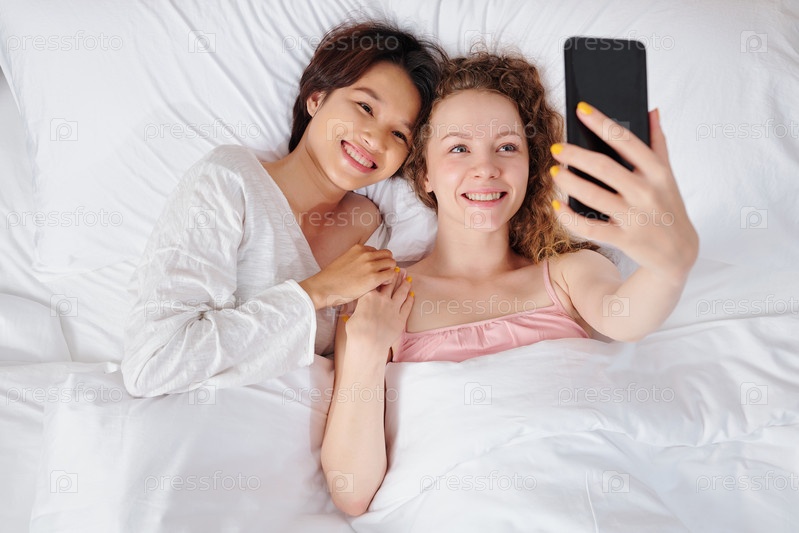 Пара, делающая селфи в постели