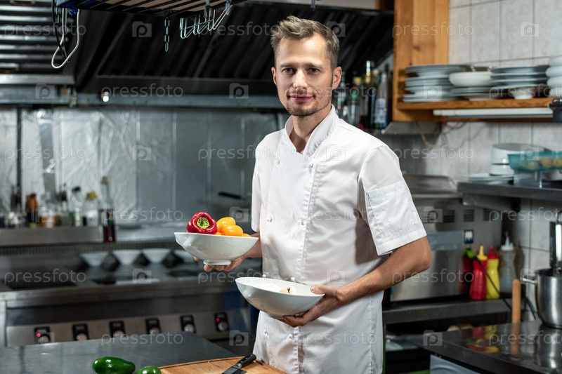 Счастливый молодой профессиональный шеф-повар в белой форме, держащий миски со свежим капсиком