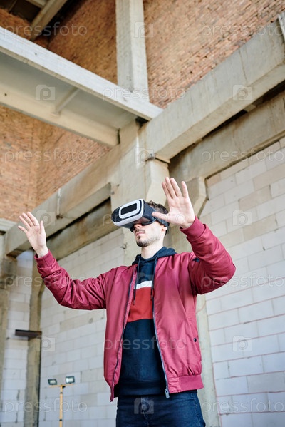 Молодой инженер в VR гарнитуре стоит перед виртуальным строительством