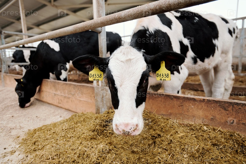 Коровы с номерными значками стоят в стойле для скота