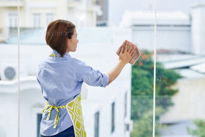Домашняя хозяйка убирает большие окна i
