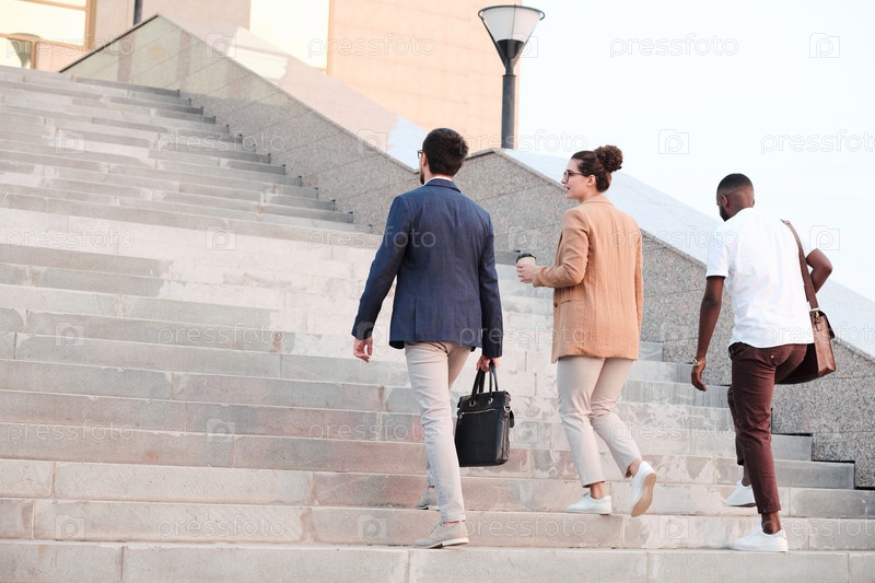 Задний вид деловых партнеров, обсуждающих новый контракт во время переезда наверх