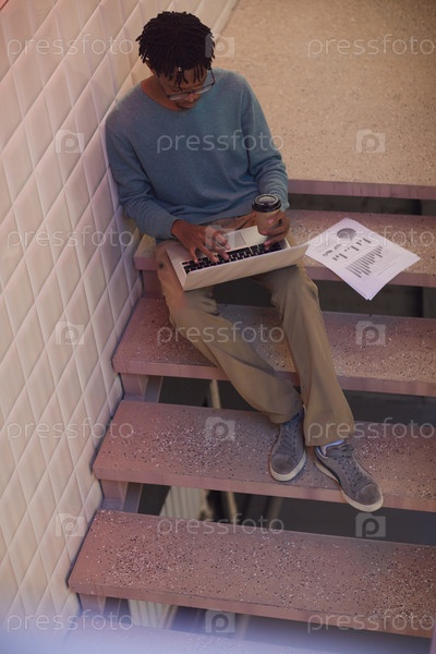Молодой человек работает, сидя на лестнице