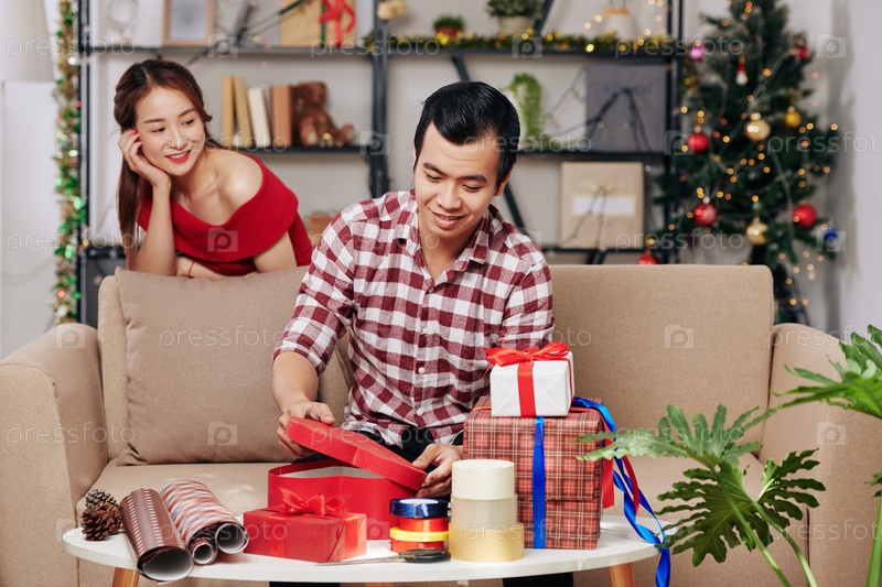 Муж упаковывает рождественские подарки