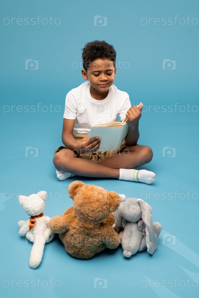 Серьезный и усердный африканский школьник читает книгу сказок своим игрушкам