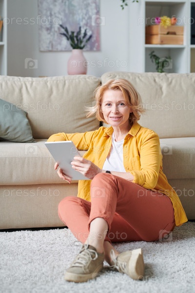 Довольно зрелая женщина с цифровым планшетом, отдыхающая на полу у дивана дома
