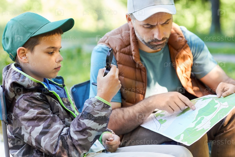 Отец и сын, ориентирующиеся по маршрутам во время похода