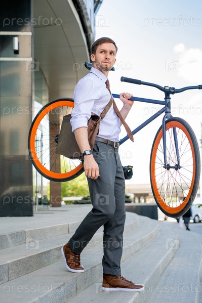 Молодой бизнесмен покидает офисное здание после работы и несет свой велосипед
