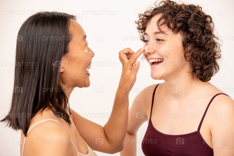 Две смеющиеся молодые межкультурные брюнетки, весело проводящие время во время процедуры по уходу за кожей