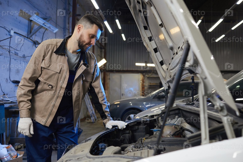Ремонтник смотрит на автомобильный двигатель