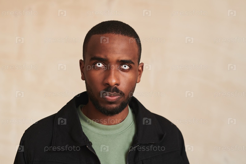 Портрет серьезного молодого бородатого чернокожего мужчины с легкими контактными линзами, стоящего на изолированном фоне