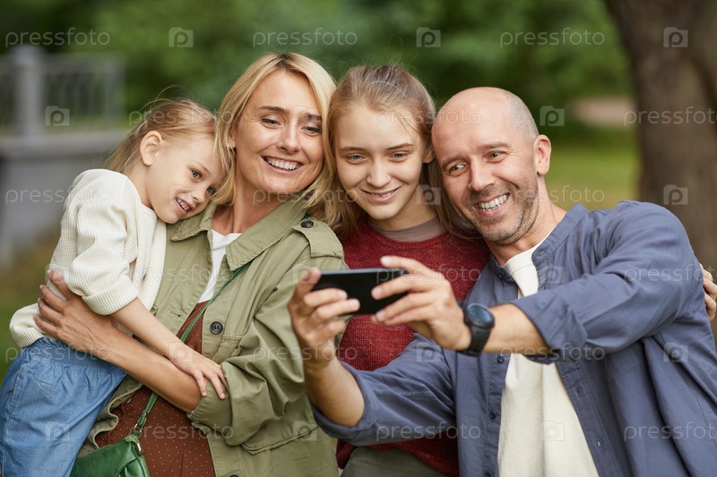 Счастливая семья разговаривает с селфи на свежем воздухе