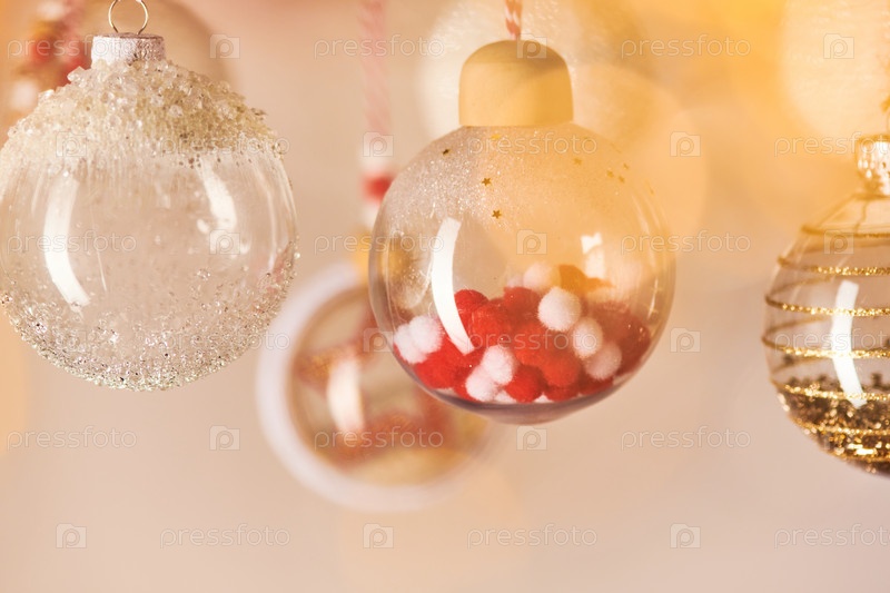 Разнообразие прозрачных декоративных шаров, висящих перед камерой и другими