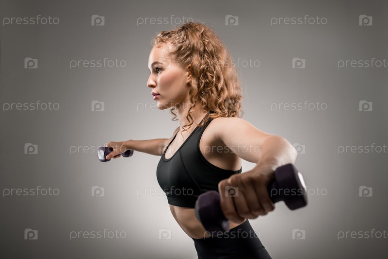 Боковой вид молодой спортсменки в спортивном костюме, поднимающей гантели и дышащей