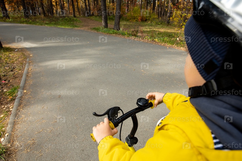 Современный активный маленький мальчик в повседневной одежде едет на своем балансовом велосипеде в парке