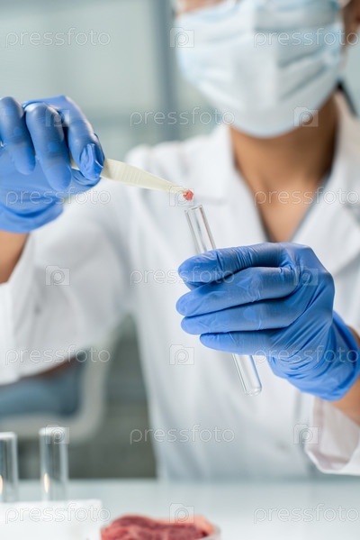 В перчатках исследователь в белом халате и маске кладет крошечный кусок мяса в колбу