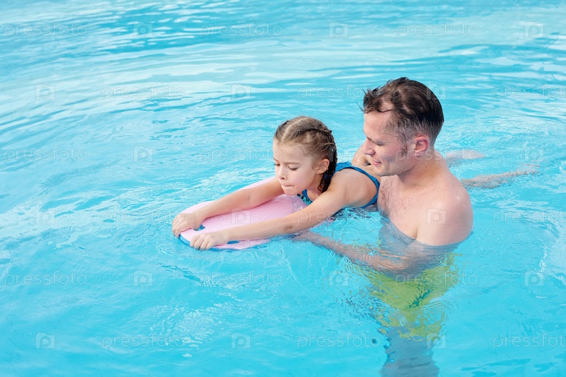 Отец поддерживает маленькую дочь плавательной доской, пока учит ее плавать