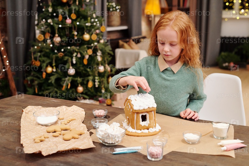 Милая маленькая девочка держит руку над крышей украшенного дома с пряничным хлебом