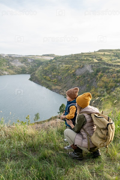 Молодая женская рюкзакистка приседает рядом со своим очаровательным маленьким сыном перед рекой