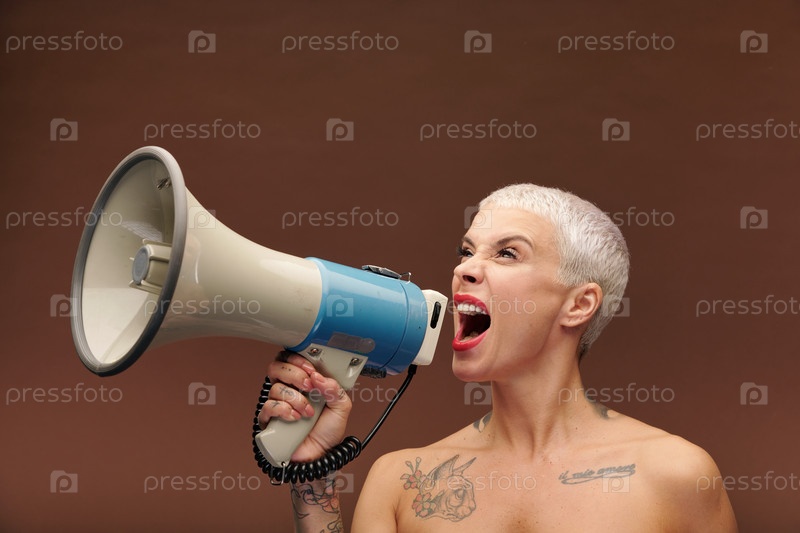 Очень сердитая женщина с татуировками на руке, груди и шее кричит в мегафоне