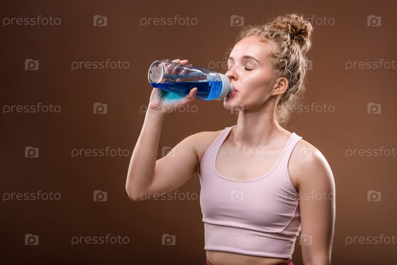 Молодая трезвая спортсменка пьет воду из пластиковой бутылки после тренировки