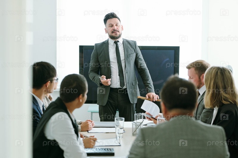 Уверенный бизнесмен среднего возраста в формальной одежде, выступающий с речью на тренировке