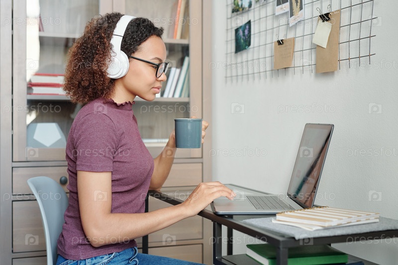 Молодая студентка смешанной расы в повседневной одежде и наушниках серфирует по сети