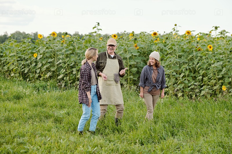 Три веселых дружелюбных человека движутся по зеленой траве вдоль поля подсолнечника