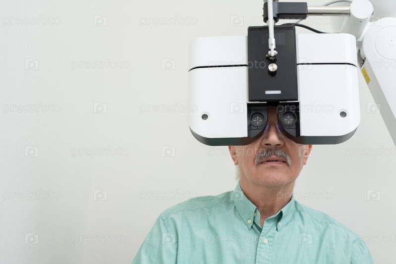 Пожилой пациент-мужчина смотрит через линзы во время проверки зрения