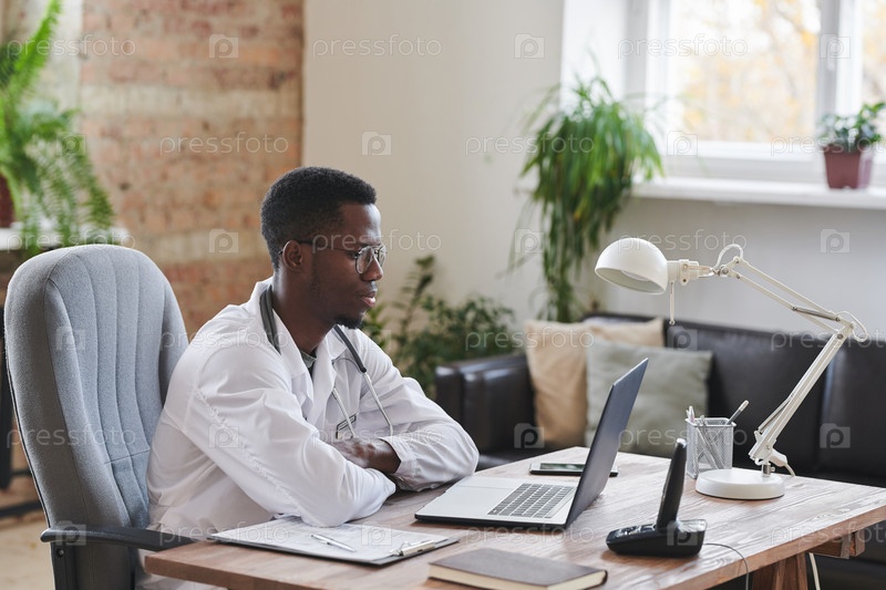 Молодой взрослый афроамериканский медицинский работник, сидящий за столом в современном офисном помещении и смотрящий что-то онлайн на ноутбуке
