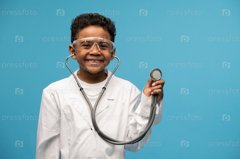 Веселый мальчик в белом халате и защитных очках, держащий стетоскоп