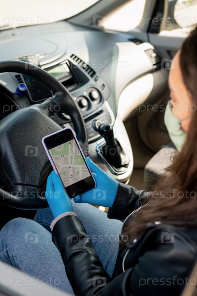 Водительница такси в защитных перчатках смотрит на карту навигатора со смартфона