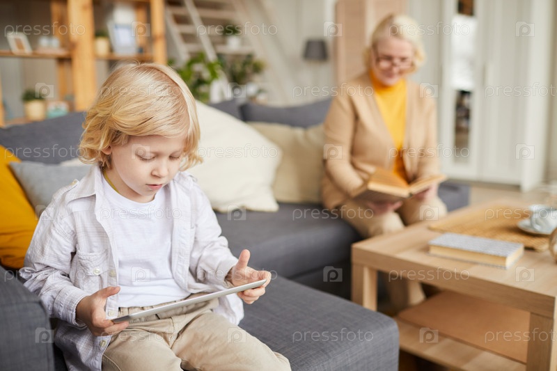 Маленький мальчик играет в планшетный компьютер