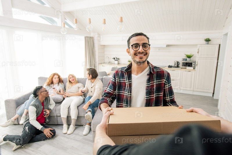 Молодой человек получает доставку пиццы
