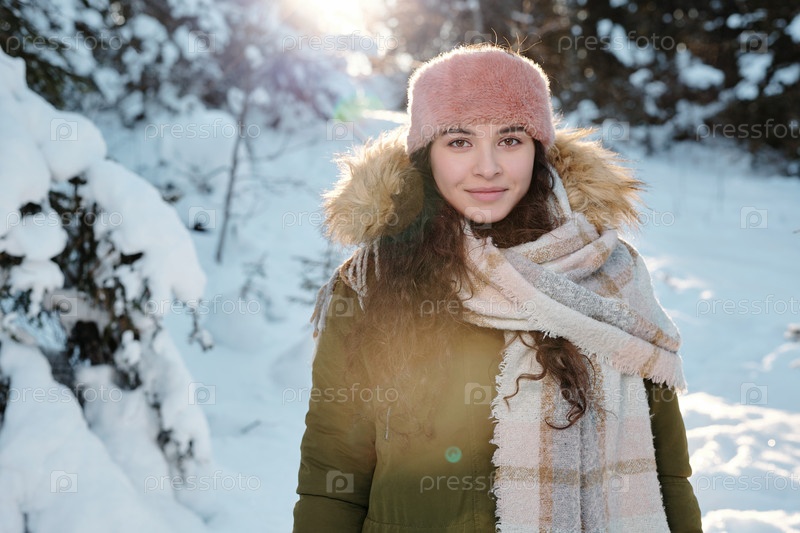 Счастливая молодая брюнетка в теплой зимней одежде стоит перед камерой