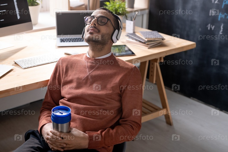 Молодой спокойный программист в наушниках, держащий кружку с напитком