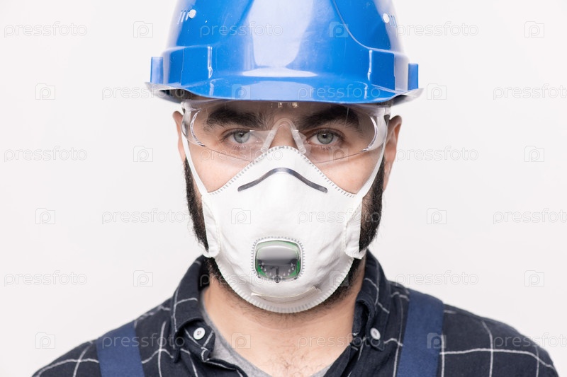 Руководитель современного инженера в Hardhat, очки и защитный респиратор
